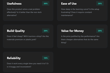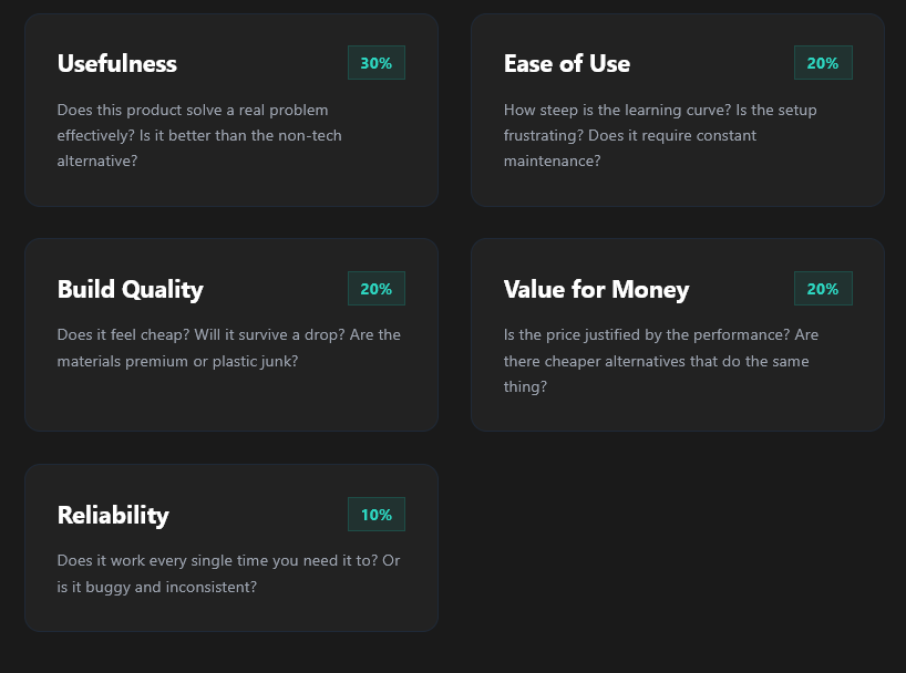 We don't pull numbers out of thin air. Every product is evaluated against 5 strict criteria to calculate its final score out of 10.